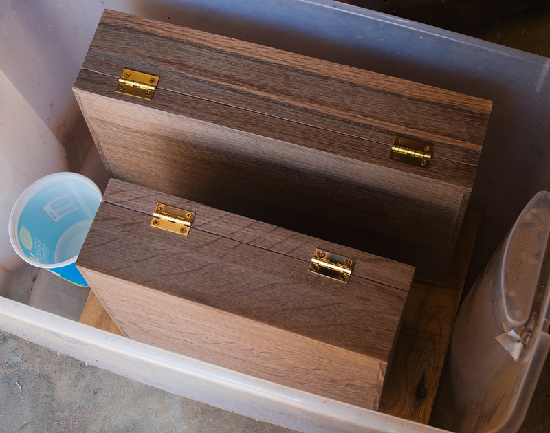 We built a couple more boxes out of oak and Joe ammonia fumed them. Last work day we cut them open and put on the hinges and hasps, and then put them back in for more fuming. Gustav Stickley would be proud.