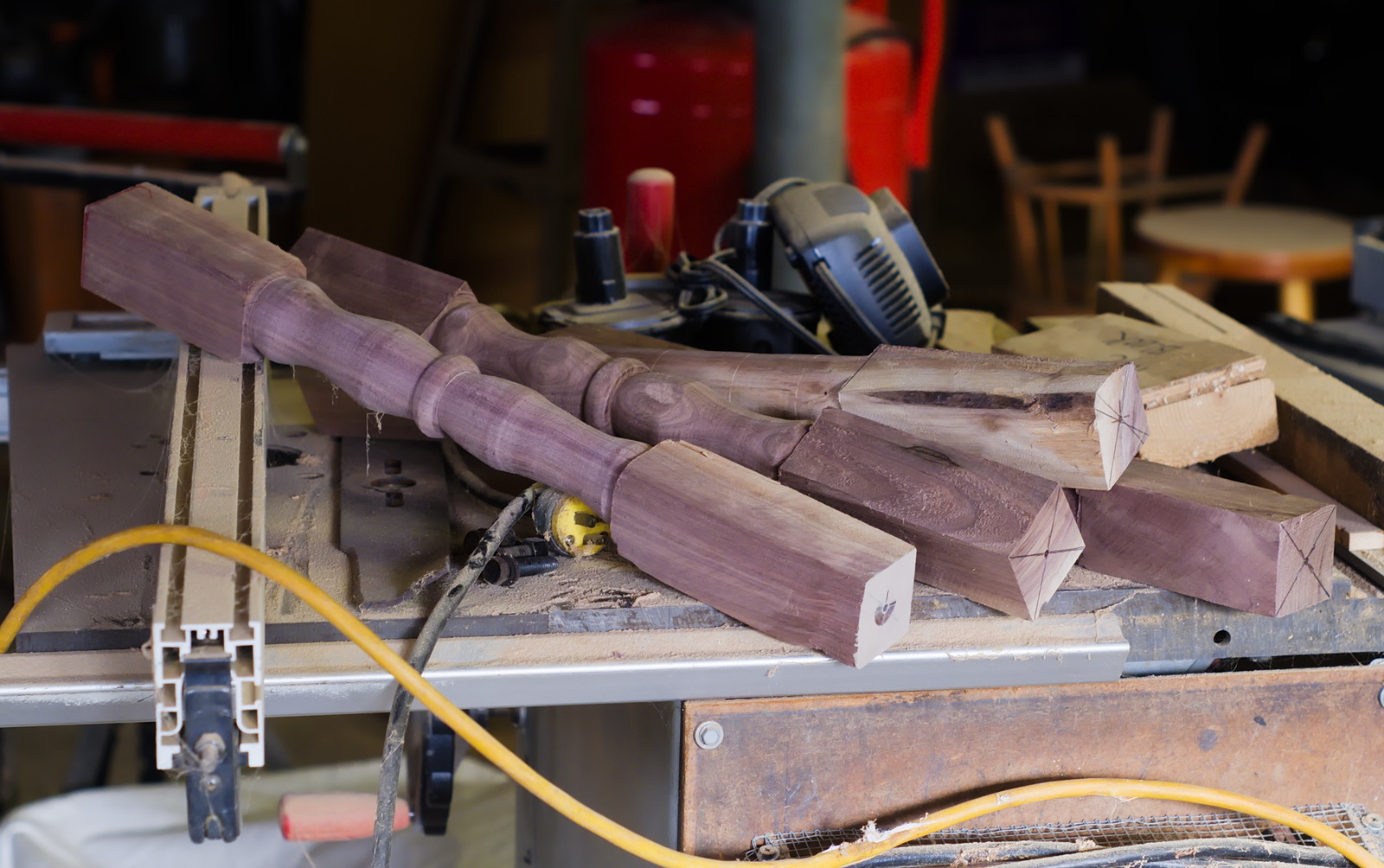 The next project is started - a joint stool from Kettel, plate 60. The top, aprons and stretchers have been rough-cut from pine, and the oak legs are at the lathe.