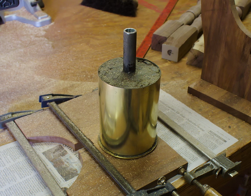 By the time I left the shop yesterday, the thread cone rack had dried enough for me to gingerly carry it out to the truck and on home, and by late in the evening it was dry enough to lightly sand and rub on a second coat of finish. This morning I repeated the process, and by the afternoon it was dry enough to install the pins and screw eyes. So now it is complete and in service on my sewing table. I expect if any quilters or sailmakers, both people who use a lot of thread, see this post, we may get some requests for duplicates.