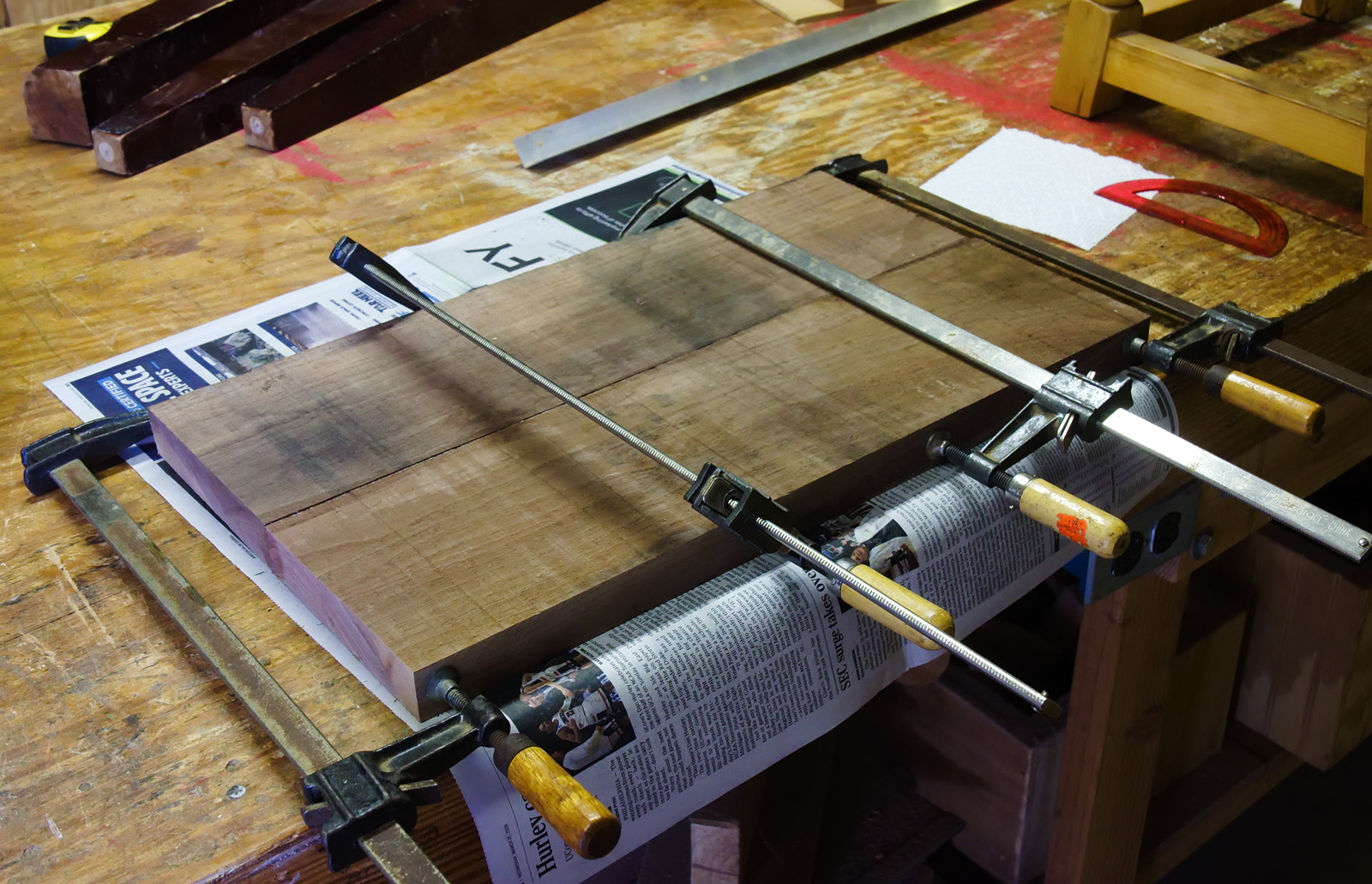 Close to the last of the 100 board feet of cedar we bought way back in November 2013. We milled out wood to build a large step-stool on the pattern of the two mahogany ones from last July. All the clamps were in use on other projects, so we bundled the parts together and will glue them into top and legs next time.