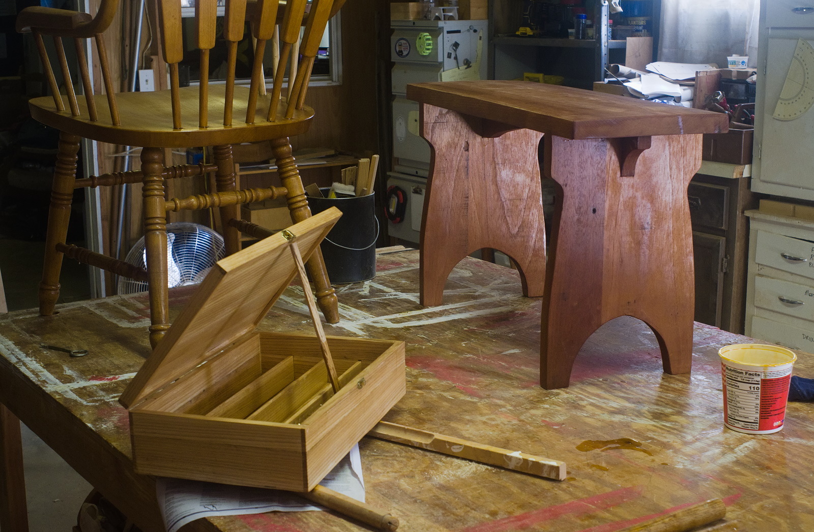 Some young people move out of the familial home with a few nice older pieces that have been stored away in the attic, but most of them have to scrounge furniture from other people's castoffs or buy a pressboard bookcase and dresser from Walmart. We like to make them a solid wood table or inlaid box or a useful bench or step-stool just so they will start to recognize that there is something better. Levi's friends used to be astonished that he would have something as nice as the simple cedar-topped trestle table we built for him and Marie way back in the early days of the shop.