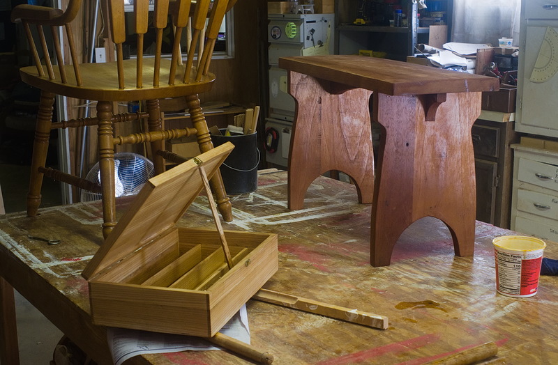 We recently completed four stepstools. Joe can find a place for three of them and I took one home, put the last two coats of finish on it, and plan to keep it. These are valuable to have because they keep you from doing stupid things like standing on a chair to reach a high shelf.