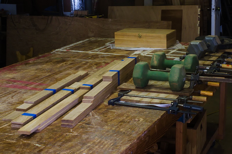 Nothing pressing in the woodshop today, so we took the opportunity to cut out parts for three slide-top boxes. We used all our bar clamps to glue up two cases, so next time we can glue up the third and make the lids.