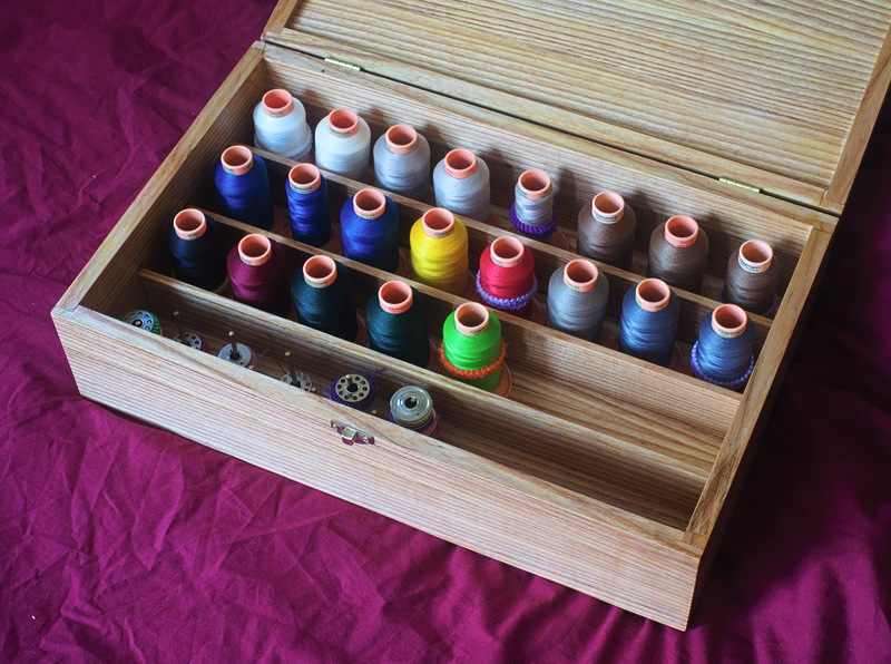 To have easy, organized storage for my Tera 80 thread cones and bobbins, we built this 10"x16" box out of ash bought at Wall Lumber years ago for some forgotten project. It is still lacking one final detail - I have ordered a length of chain to make a lid stay.